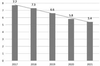 图1 2017—2021年我国结婚率数据来源:《2021年民政事业发展统计公报》