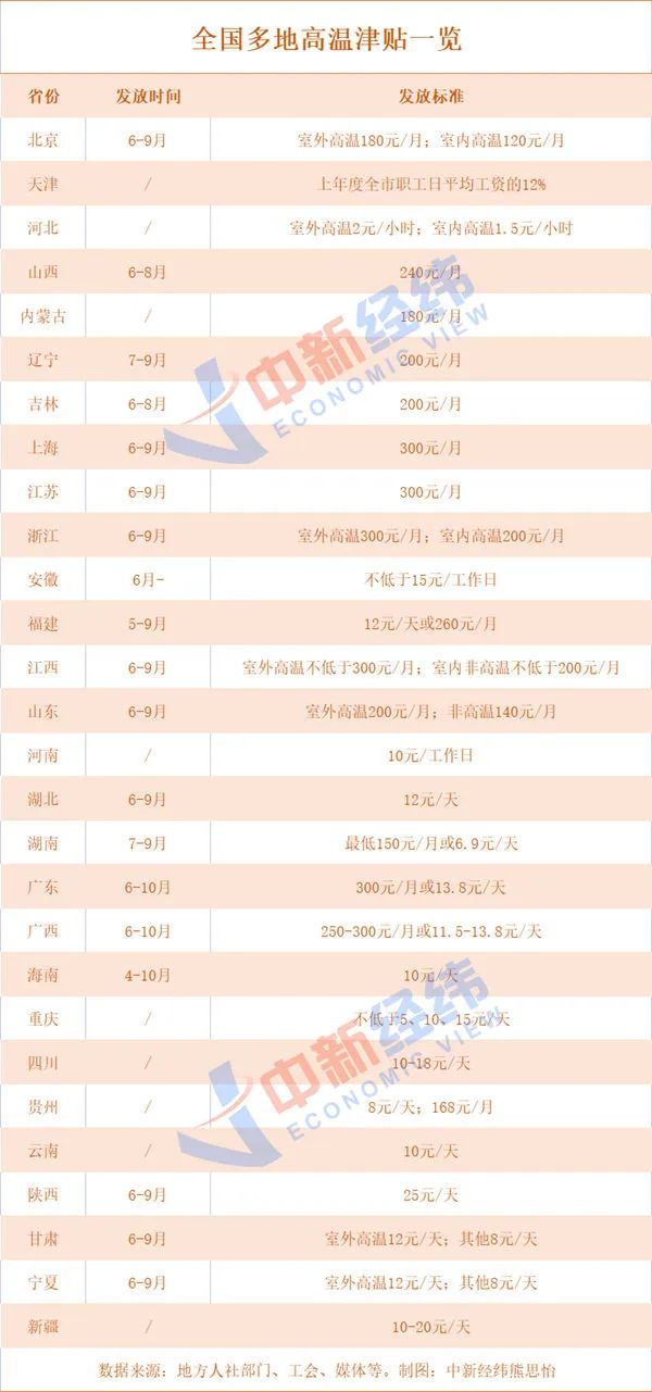 部分省份高温津贴发放标准