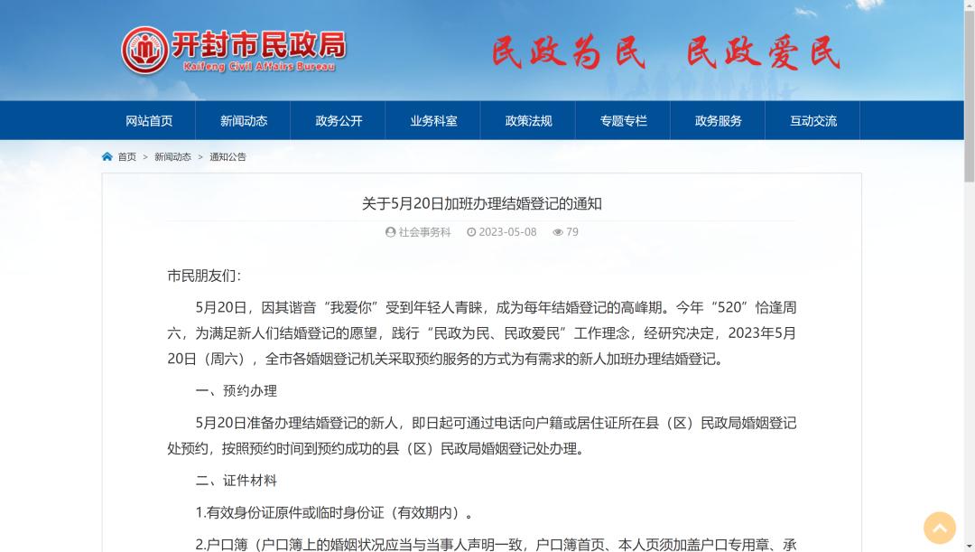 5月8日,河南省开封市民政局发布通知:经研究决定,2023年5月20日(周六),全市各婚姻登记机关采取预约服务的方式为有需求的新人加班办理结婚登记。5月20日准备办理结婚登记的新人,即日起可通过电话向户籍或居住证所在县(区)民政局婚姻登记处预约,按照预约时间到预约成功的县(区)民政局婚姻登记处办理。开封市民政局提醒,为合理安排办理结婚登记的等待时间,最大程度满足新人们的结婚登记需求,5月20日当天,全市各婚姻登记机关只受理结婚登记业务,不受理其他业务。未进行预约的,建议在正常工作日进行办理。