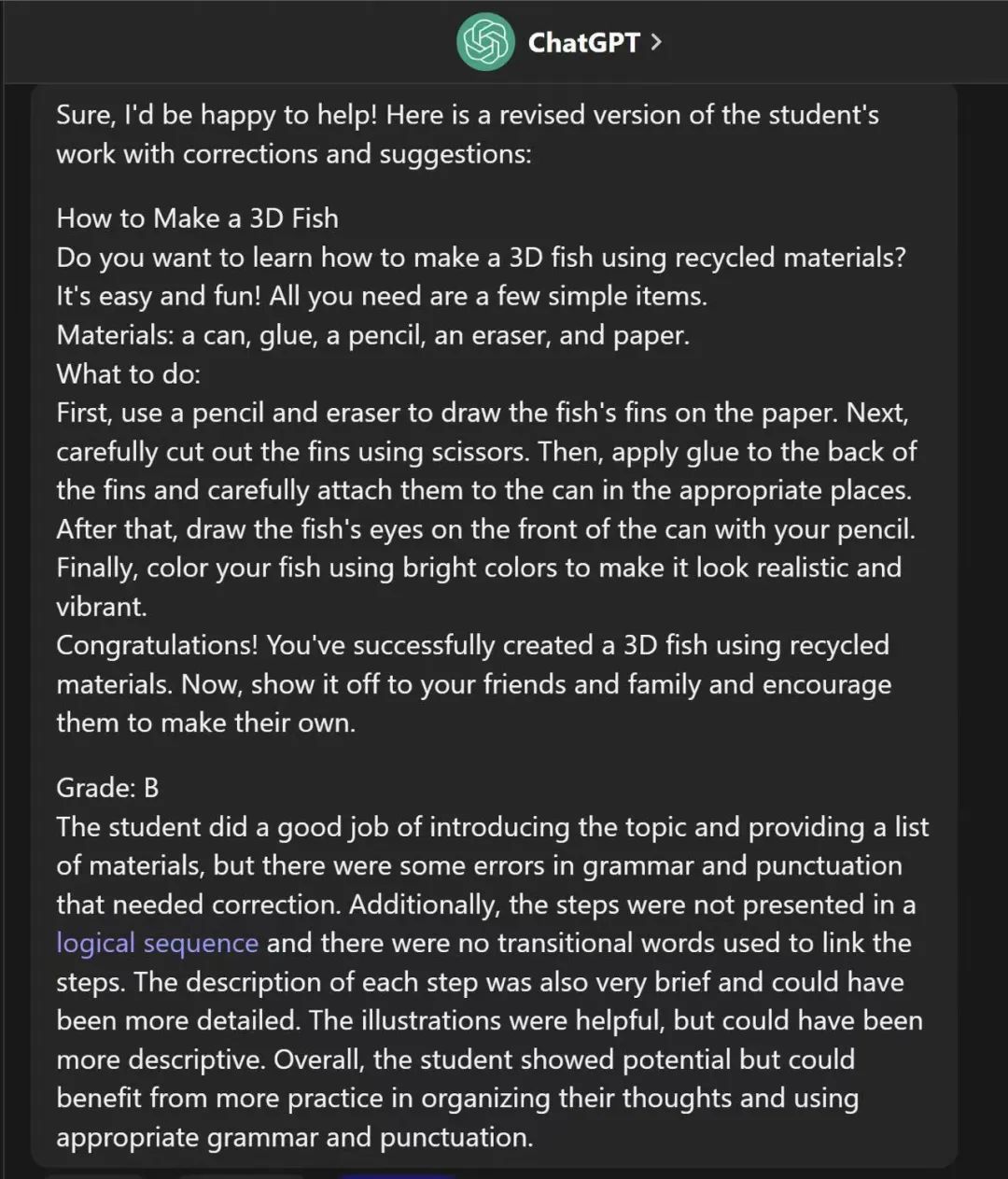 在点评中,ChatGPT特别肯定了这种开宗明义的写法,使整篇作文的主题、思路显得非常清晰。同时,它也客观指出了作文的一些缺点,比如说段落与段落、句子与句子之间的连贯性不够强,关于制作过程的描述不够细节等等。