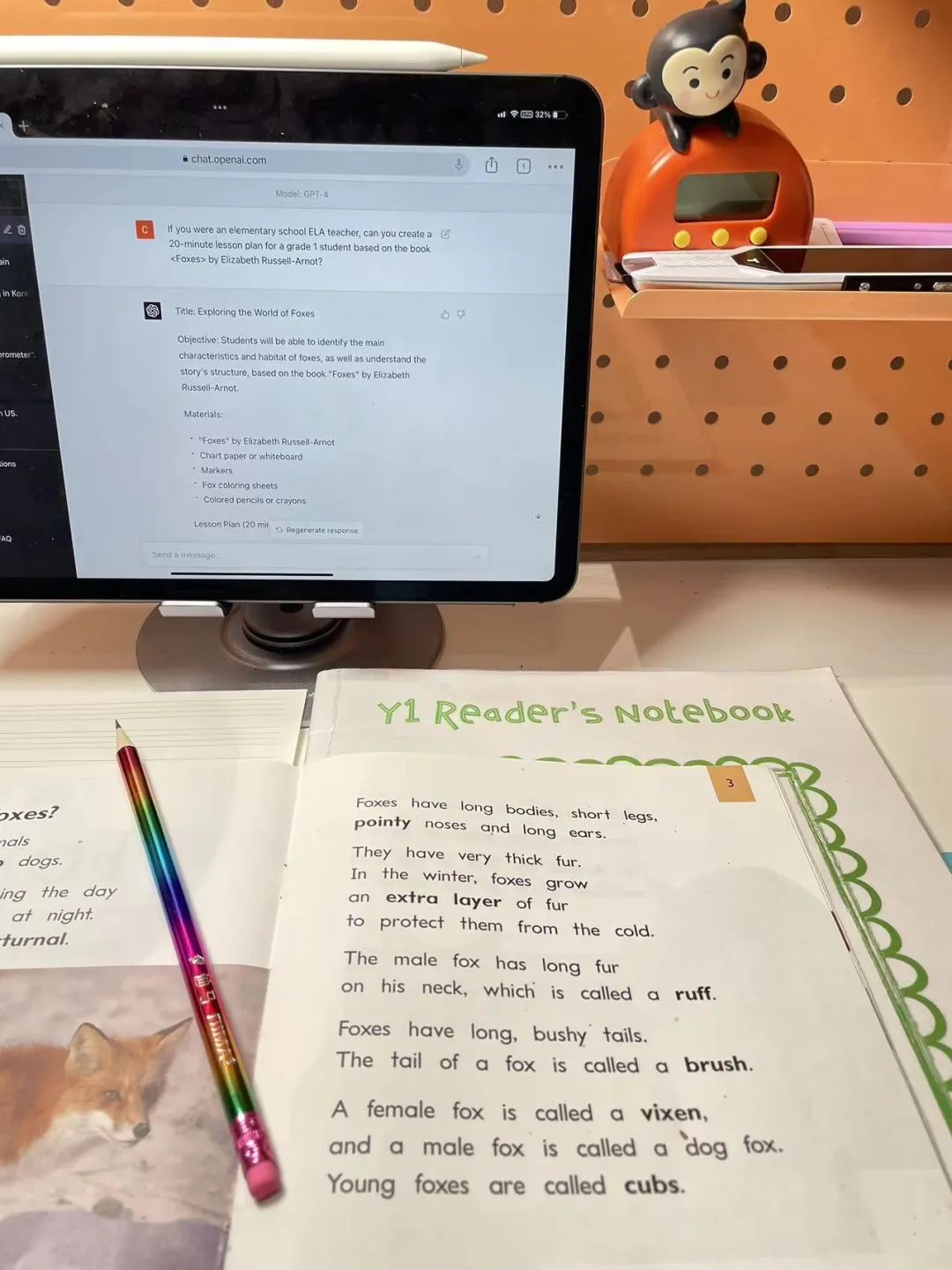 以前,鑫妈需要自己先读一遍,然后整理思路、备课,出题目,完整一套流程下来,怎么也得一两个小时;但现在,这个备课的工作,已经基本交给ChatGPT了。若想要全英文授课,还能让它生成逐字的讲稿教案。