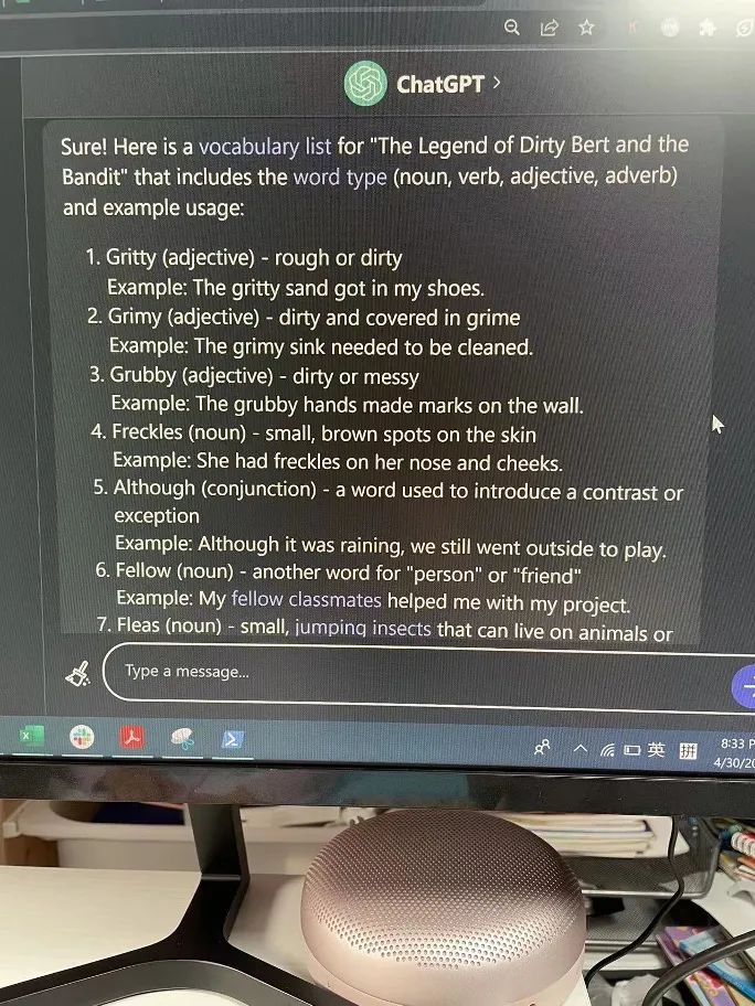 将书名作者以及孩子不认识的词汇输入给ChatGPT,要求它生成出带注释、词性和例句的单词表正是这种提升效率的思路,才是她最希望孩子去学习和感受的。
