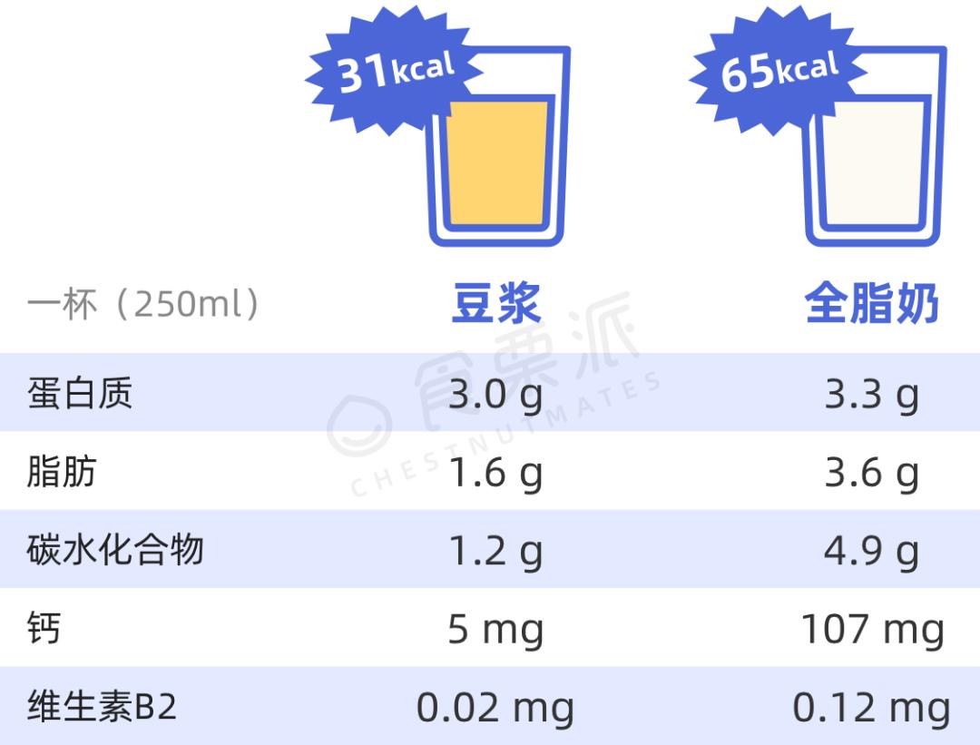 但和牛奶(全脂牛奶)相比,豆浆的热量、脂肪更低,饱和脂肪远低于牛奶,这一点对于肥胖、血脂高的人来说是比较好的。