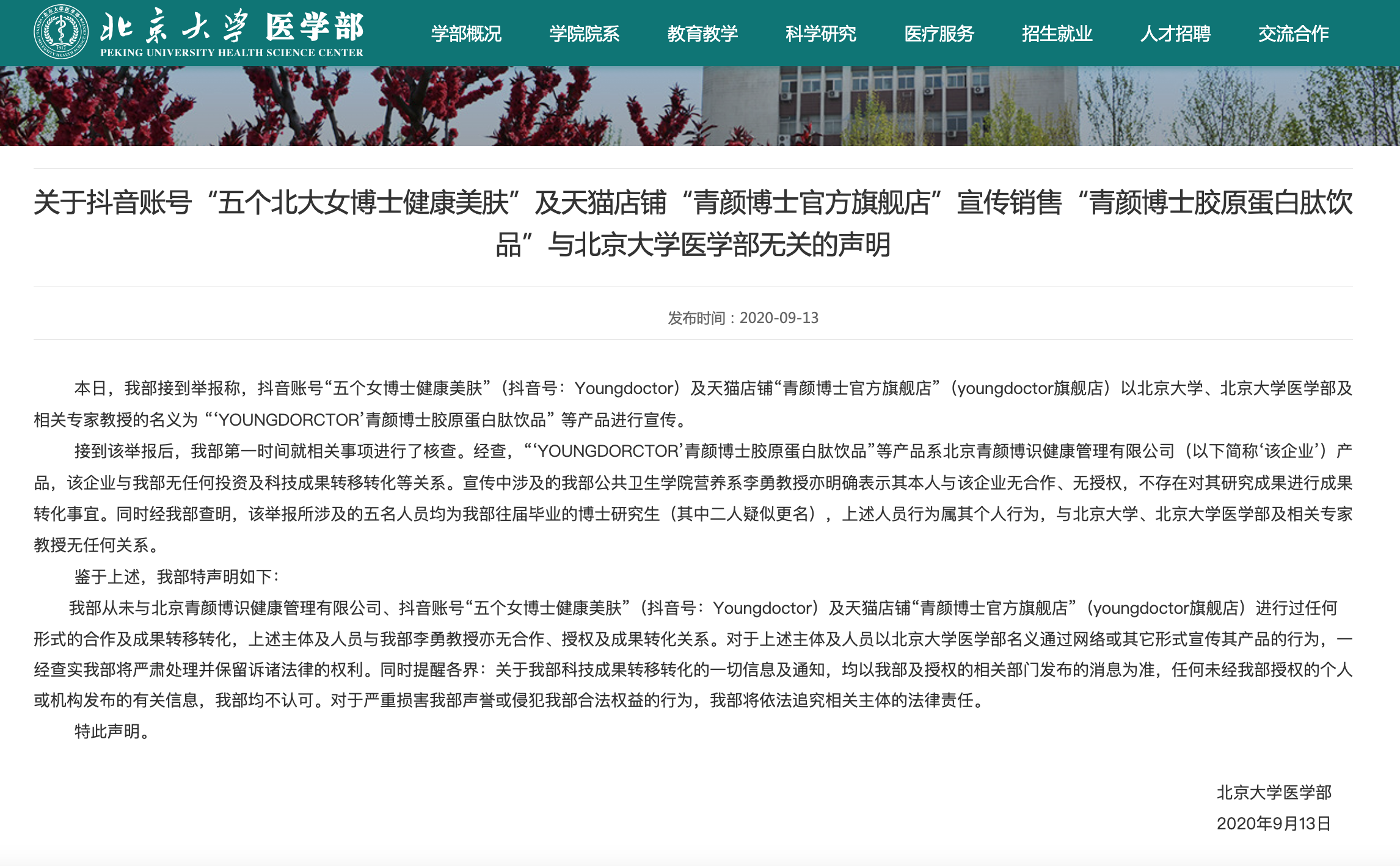 不过,北京大学医学部曾于2020年9月发布声明,接到举报称,抖音账号“五个女博士健康美肤”及天猫店铺“青颜博士官方旗舰店”以北京大学、北京大学医学部及相关专家教授的名义为“‘YOUNGDORCTOR’青颜博士胶原蛋白肽饮品” 等产品进行宣传。