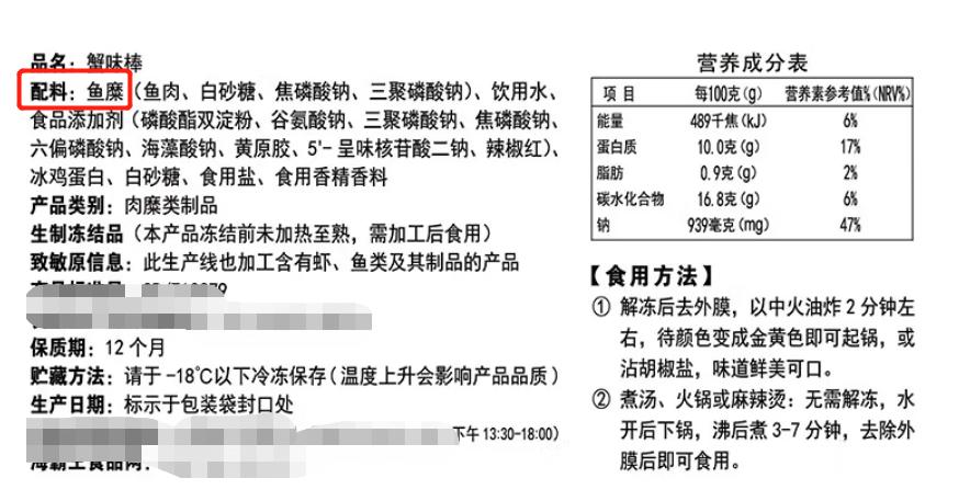 购物网站某商品截图因为你看他的配料表,写在第一位的是鱼糜(也就是用鱼肉、白砂糖等等做出来的),然后就是一些食品添加剂,饮用水、食用盐,和食用香精等。