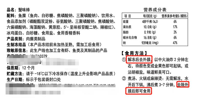你会发现,在配料表中一般都是没有蟹肉的。