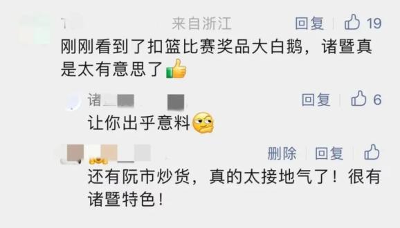 在店口何家山头村的揭幕战上,扣篮比赛奖品是白塔湖大白鹅和阮氏特色炒货,本土味十足,氛围感直接拉满,现场观众直呼过瘾!