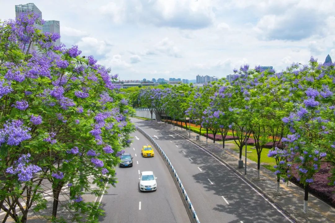重庆街头盛开的蓝花楹。邹乐 摄