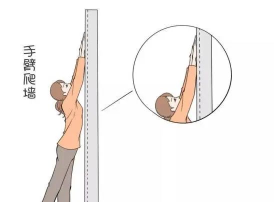慢性期疼痛已得到缓解,此阶段主要表现为肩关节粘连,可出现“抬肩”、“抗肩”等关节活动受限,此时可增加关节运动改善血液循环,松解粘连组织,但应以不感到疼痛为前提,可做手指爬墙、背手、钟摆运动、旋肩摆手等动作。