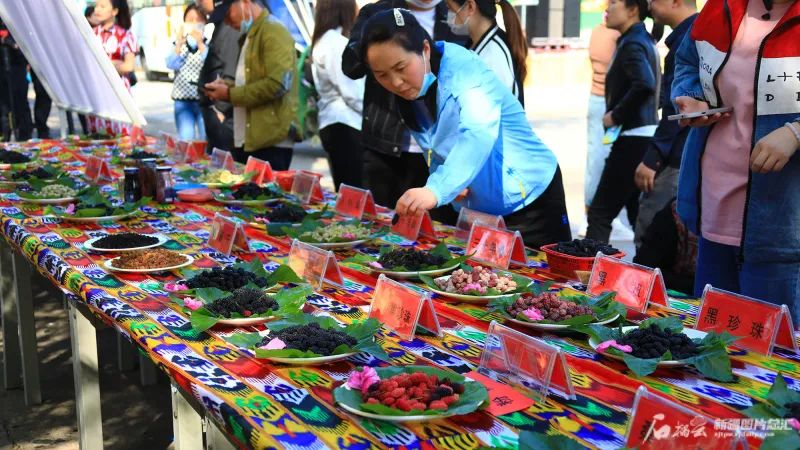 5月7日,托克逊县在郭勒布依乡开斯克尔村举办桑葚文化旅游节。图为游客在品尝各类桑葚。李靖海摄