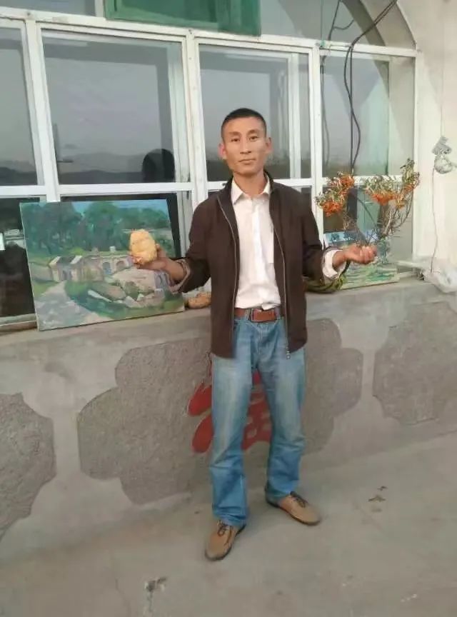 ●在老家窑洞前,我一手拿着高原旱作黄皮土豆,一手拿着沙棘果枝,请前来写生的同学给我留了一张影。