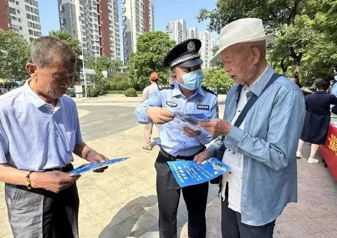 ▲5月15日上午,庐阳分局安庆路派出所民警和合肥义警走进社区开展宣传,提醒老人防范免费旅游、保健品推销等陷阱。