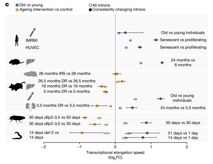 此前,顶刊Nature上刊登的研究便从基因角度切入,证实了“限制饮食延寿”的深层机制——基因的平均转录延伸速度会随着年龄的增长而增加,这会导致转录更易出错以及质量的降低,最终导致机体的衰老;但限制饮食可以减缓基因的转录速度,从而延长10-20%的寿命。