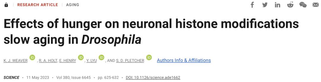 [3]K. J. Weaveret al.,Effects of hunger on neuronal histone modifications slow aging in Drosophila.Science380,625-632(2023).DOI:10.1126/science.ade1662