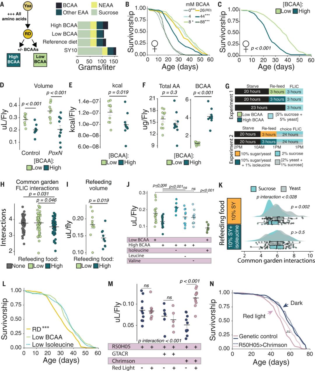 饥饿感,是本研究的重点研究对象之一。为了使实验果蝇达到饥饿的状态,研究者减少了实验组膳食BCAAs的摄入量,有意思的事情出现了——低BCAA组果蝇反而摄入了更多的食物,这意味着减少饮食中的BCAAs会导致更强且更持久的饥饿感。