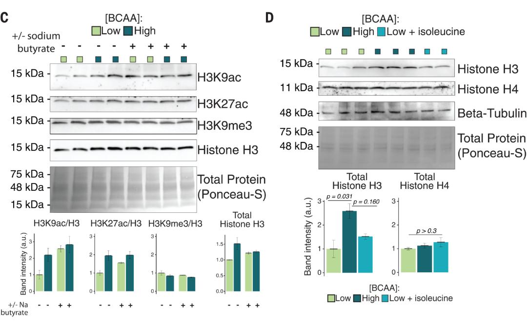 支链氨基酸BCAAs会改变组蛋白乙酰化和H3丰度