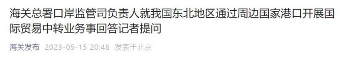5月15日,海关总署口岸监管司负责人就我国东北地区通过周边国家港口开展国际贸易中转业务事答记者提问时表示,为降低我国东北地区大宗货物南运物流成本,从2007年起,我国按国际中转业务,同意该地区货物运至毗邻国家港口中转再运抵我国南方港口入境。