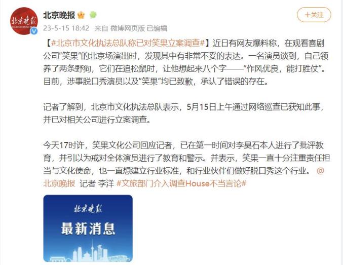 近日有网友爆料称,在观看喜剧公司“笑果”的北京场演出时,发现其中有非常不妥的表达。目前,涉事脱口秀演员以及“笑果”均已致歉,承认了错误的存在。北京市文化执法总队已对相关公司进行立案调查。