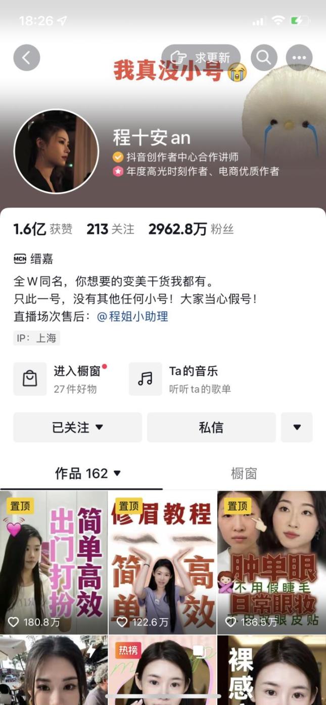 程十安抖音账号有近3000万粉丝,截至发稿,她的抖音账号