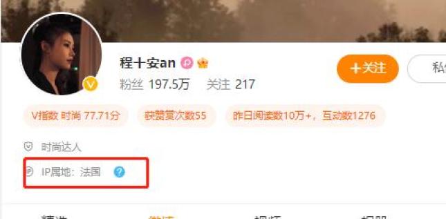 记者搜索程十安的官方微博,发现她的IP显示在法国。