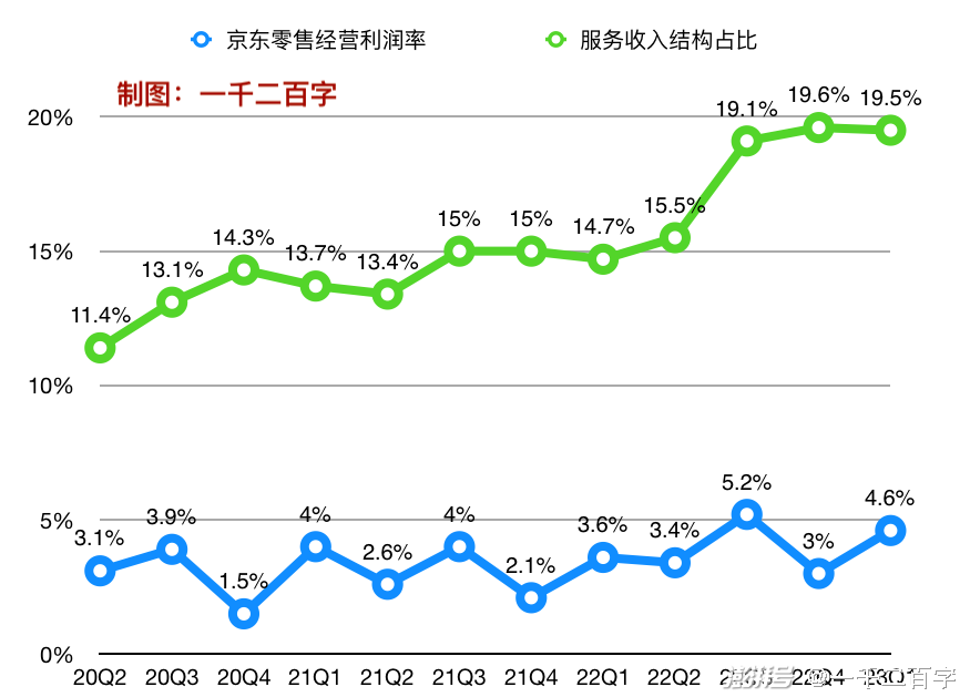 或许京东的转型已经拉开大幕。当服务收入占比未来继续抬升,上面图表中的两条曲线应该会产生更多关联性,迎来一个不一样的京东。