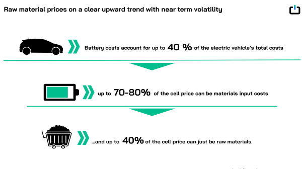 而在电动化转型过程中,大众之所以大举进攻电池领域,还是因为成本的不能承受之重。根据其计算的数据,电池成本占整车成本的40%,材料成本占据了电池成本的70%—80%,原材料成本占据了电池材料成本的40%。