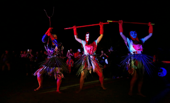 提及演傩戏,人们喜笑颜开,兴奋万分,扛着板凳,顶着孩子,拉着老人,一家人高高兴兴地出发。十里八乡,鸡犬相闻。人们一边磕着瓜子,一边看戏,一边纳鞋底。还有把小孩顶在肩头上的,还有把老婆顶在肩头上的。表演傩戏的人,有站立在道具上表演的,四五个并排跟随道具转动。这些人他们伸开臂膀,像神仙一样飞翔。场面最壮观的还是数道具下的表演:有的穿着蓑衣,赤脚挥动刀叉棍棒;有露左臂的,有露右膀的;有的手持盾牌戈斧,上身着黄布褂,下穿红裤加靠腿,脚蹬草鞋或麻鞋,或弓背或仰面,脚迈丁字步,动作各异,节奏感强;手持擀面杖的不停地敲打地面,发出阵阵强而有力的节奏响声;手拿洗锅刷的模仿洗锅刷碗,或是模仿其他滑稽的形态等。表演形象逼真,栩栩如生。入戏太深的人们,早已忘记了自己是谁,一边观看,一边手舞足蹈,台上台下相互呼应,流连忘返。傩戏配上独特的面具、独特的唱腔、独特的音乐曲牌、鼓点和不同性格的角色,深受人们喜爱。傩戏已根植川东北这片土地,从农庄到舞台,从舞台到中央电视台,享誉世界。
