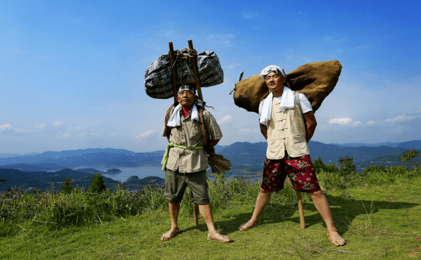 2 吼拐与劳动号子 劳动号子大多无固定歌词,多靠“哟嗬”“吆嗬”之类的喊唱来舒缓劳动的紧张和强度。双峰山高路窄,劳动环境艰苦,农民为了减轻背负劳作的重量,便创造了一种类似拐杖的劳动工具——拐,又俗称“打杵子”,休息时撑在背篼或背架子下面承重。当用“拐”歇气时,不觉张嘴就吼开了。1959年,在四川省群众业余文艺调演中,寨山村米月德一首《吼拐》曲惊四座,被专家誉为西南的”花儿”和“信天游”。