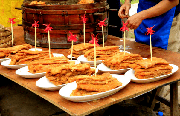 馓子是一种油炸食品,香脆精美。馓子是先用盐水和面,将面和好后,在上面抹一层薄薄的菜油,用湿毛巾搭上,让其自然发酵,夏天发十分钟,冬天发一小时左右。面发好后,将面盘成粗藕节般的大条,再发酵十分钟,又将其盘为小指头粗的小条,用干米粉扑面后,右手握起小条,左手捏小条一端作纺车状运行,将小条绕成更细的面圈,然后将面圈套在两根长筷子样的竹签上,再将面圈拉细、绷直下锅用油炸,炸至面圈变硬之前,翻转竹签将其扭成梳子状,待成金黄色时,即可起锅备用。兑碗时先将油茶舀入碗中,再加上捏碎的馓子,同时加上切成小块的大头菜、捣碎的花生米、椒盐、葱花、红油等,即可上席供顾客享用。