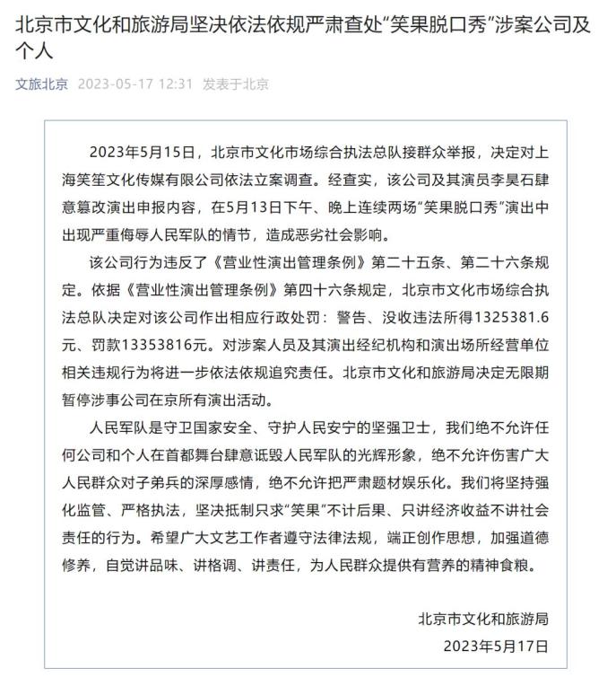2023年5月15日,北京市文化市场综合执法总队接群众举报,决定对上海笑笙文化传媒有限公司依法立案调查。经查实,该公司及其演员李昊石肆意篡改演出申报内容,在5月13日下午、晚上连续两场“笑果脱口秀”演出中出现严重侮辱人民军队的情节,造成恶劣社会影响。