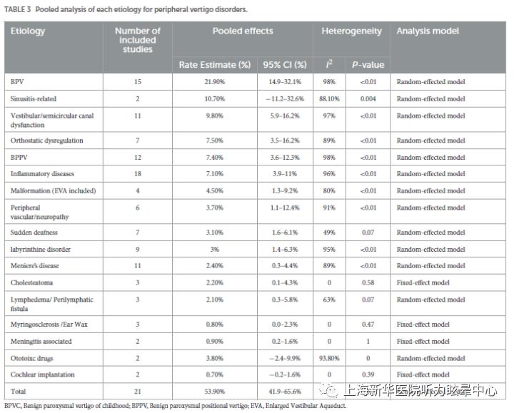 在涵盖病因最多的外周性眩晕中,对各种病因发病率进行加权后比较分析,结果提示,导致儿童眩晕的病因分别是儿童良性阵发性眩晕(BPVC, 19.50%, 95% CI: 13.5-28.3%)、前庭损伤/半规管损伤导致的眩晕(9.80%, 95% CI: 5.9-16.2%)、直立调节障碍(7.50%, 95% CI: 3.5-16.2%)、儿童良性阵发性位置性眩晕(BPPV, 7.40%, 95% CI: 3.6-12.3%)和炎症相关疾病导致的眩晕(7.10%, 95% CI: 3.9-11%)。