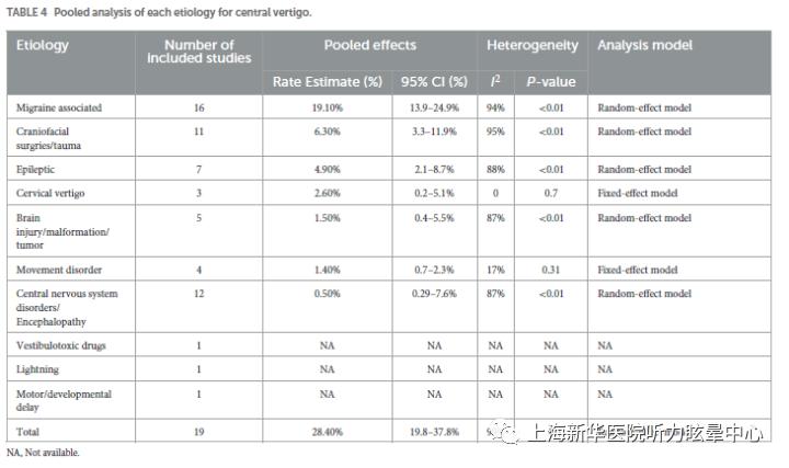 表2 儿童外周性眩晕中各项病因的加权分析在儿童中枢性眩晕的病因中,发病率最高的前三个病因分别是前庭性偏头痛(19.10%, 95% CI: 13.9-24.6%)、颌面手术/创伤(导致中枢神经受损)(6.30%, 95% CI: 3.3-11.9%)、癫痫(4.90%, 95% CI: 2.1-8.7%)。而在其他系统疾病导致的儿童眩晕中,心源性眩晕(9.00%, 95% CI: −6.7-24.6%)和免疫性眩晕(3.5%, 95% CI: 1.3-9.4%)发病率最高。