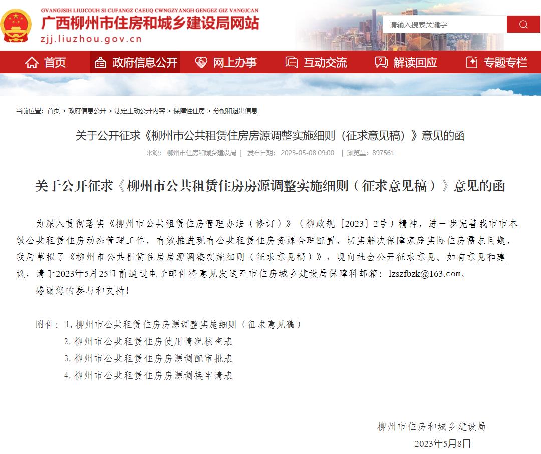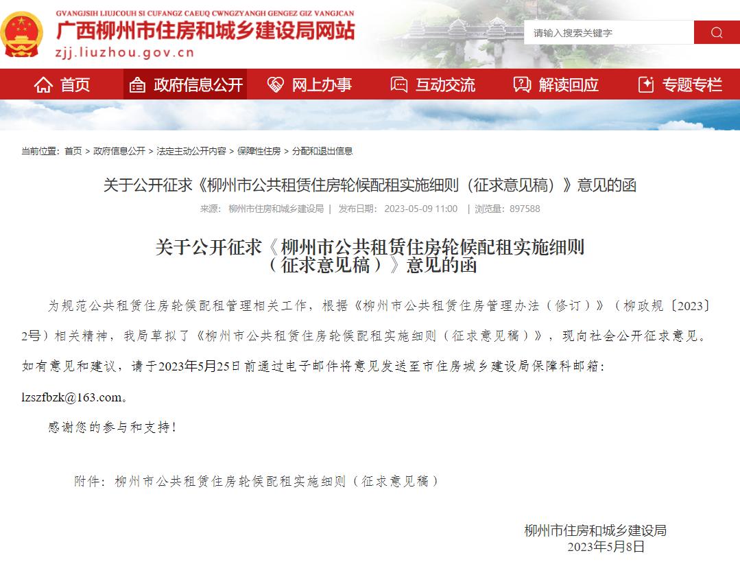 近日,柳州市住房和城乡建设局发布《柳州市公共租赁住房房源调整实施细则(征求意见稿)》和《柳州市公共租赁住房轮候配租实施细则(征求意见稿)》。公告称,为有效推进现有公共租赁住房资源合理配置,切实解决保障家庭实际住房需求问题,结合我市实际,制定本实施细则。