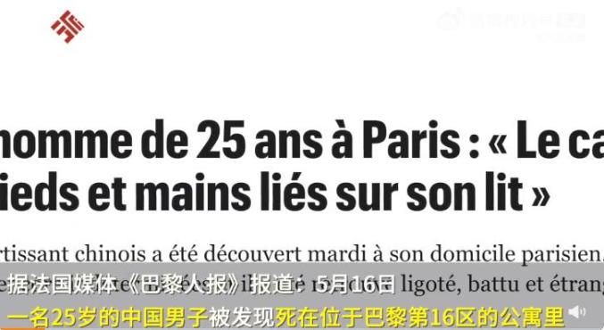 2023年5月16日,据法国媒体《巴黎人报》报道,一名25岁的中国男子被发现死在位于法国巴黎第16区的公寓里。