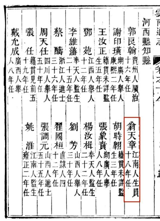 清雍正年间《云南通志》书影,其中记录了翁天章任河西县知县的时间