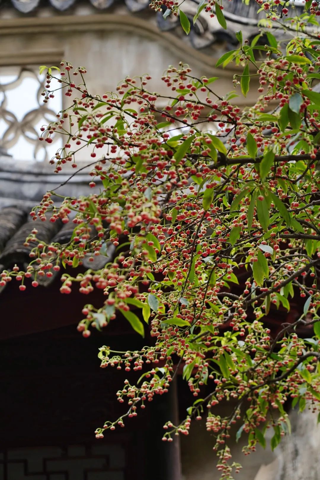 每到江南五月天,暖风熏人,雕花楼内树木葱茏。佛楼前的孩儿莲绽放于枝头,远看如错落高挂、繁星点点的红灯笼,树身盘旋而上,遒劲古朴,成为一道古韵悠长的风景线。