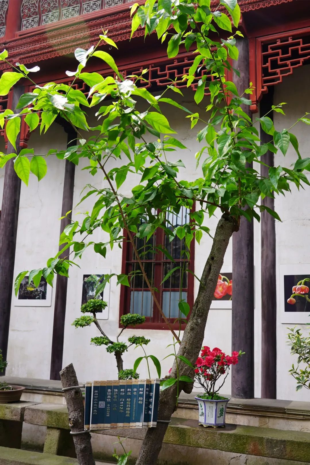 砖雕旁植有一株编号吴中334的紫薇古树,借东墙而种,取“紫气东来”之意,树龄约有212年。它枝条舒展,树干光滑洁净,七月盛夏时分,紫薇花开,花满枝头,与百年老宅相映成趣。砖雕迎面相对的是奇崛遒劲的湖石假山,为“香山帮古建”石刻的代表作,一株编号为吴中335的含笑紧挨其侧,树龄约162年,分枝繁密,直立不阿,纯净清鲜。另有编号分别为338与341的两株蜡梅,枝条看似瘦削,根部却粗壮,皆已有100多年历史。