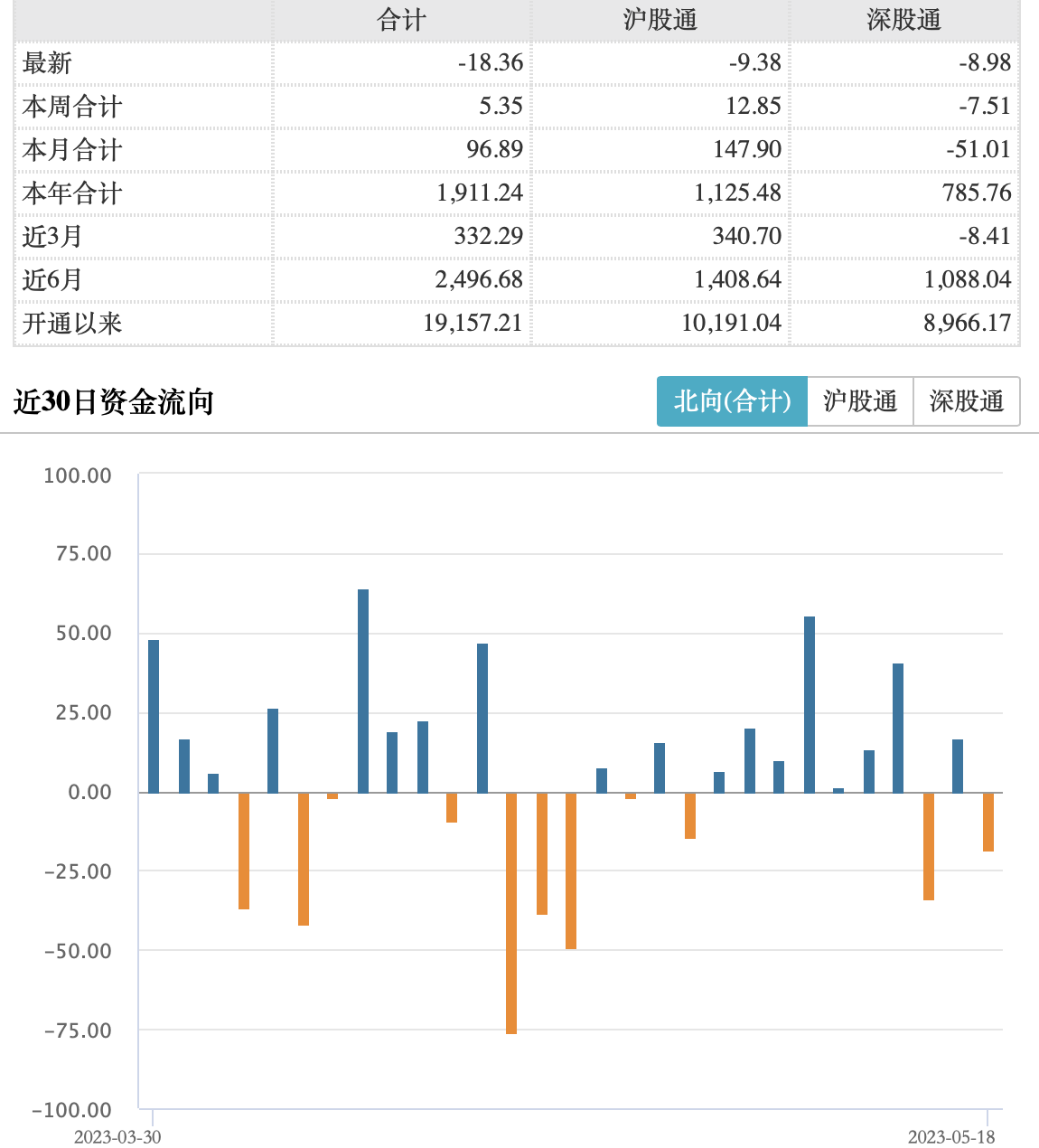 净卖出18.36亿元5月18日,北向资金合计买入成交499.89亿元,卖出成交518.25亿元,合计成交额1018.14亿元。全天成交净卖出18.36亿元,其中,沪股通合计成交额492.52亿元,成交净卖出9.38亿元;深股通合计成交525.62亿元,成交净卖出8.98亿元。