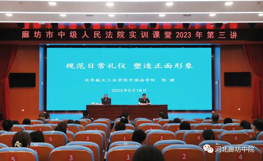为树立和维护审判机关良好形象,加强机关内务规范化管理,进一步推动模范机关创建,5月18日下午,廊坊中院举办2023年第三期实训课堂,邀请北华航天工业学院外国语学院党委书记、院长陈健教授就规范司法礼仪进行授课指导。廊坊中院党组副书记、常务副院长张凤岭主持会议。中院在家院领导及各部门负责人、部分干警、聘用人员、实习学生参培训。