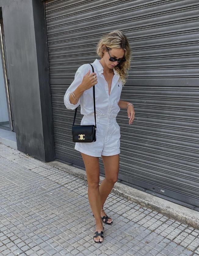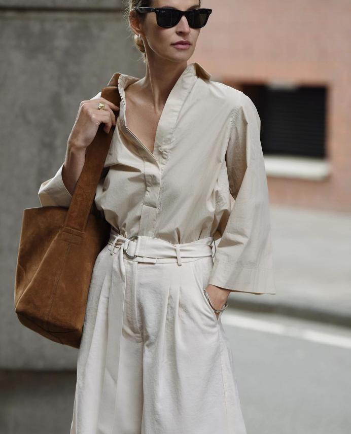 可以选择夏日不可缺少的全白搭配,只要把上衣换成有设计感的法式小衫,瞬间打破沉闷,穿出浪漫精致感。