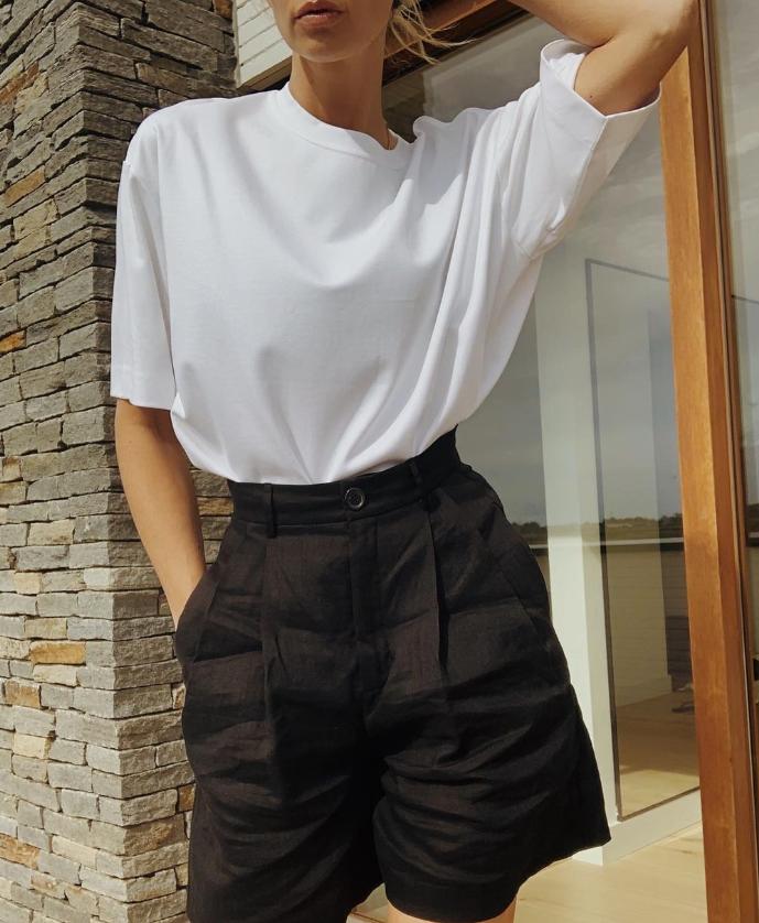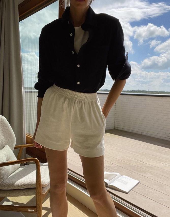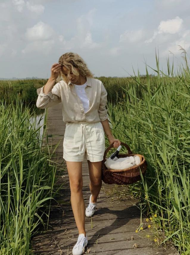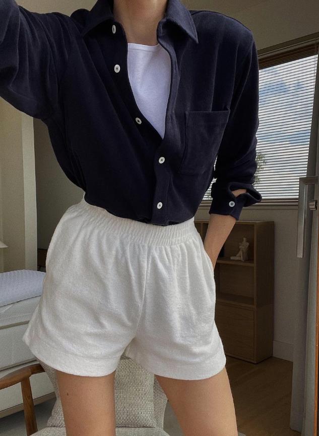 休闲短裤一般是常见的棉麻面料、卫衣面料,或者轻薄且速干的运动服料子,穿上是自在又舒服的感觉。这种类型的单品搭配起来也超简单,随意来一件上衣就能刚好适配~