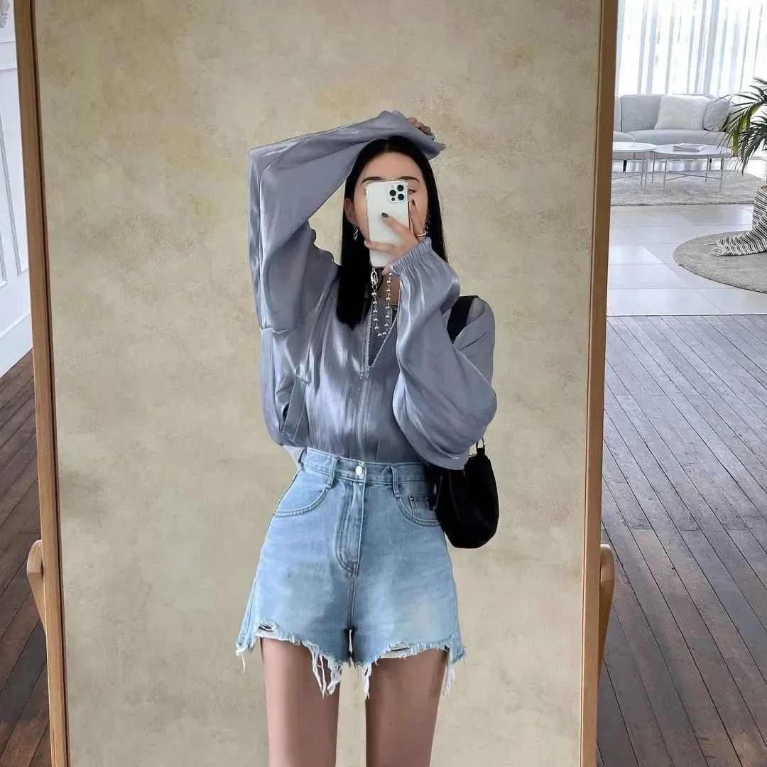 夏天常穿的防晒衫和牛仔裤搭起来也很自然,缎面的材质配合金属饰品,穿出高级感。