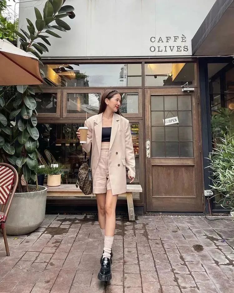 西装外套的廓形稳重会中和骑行裤的休闲感,休闲又不会太休闲。