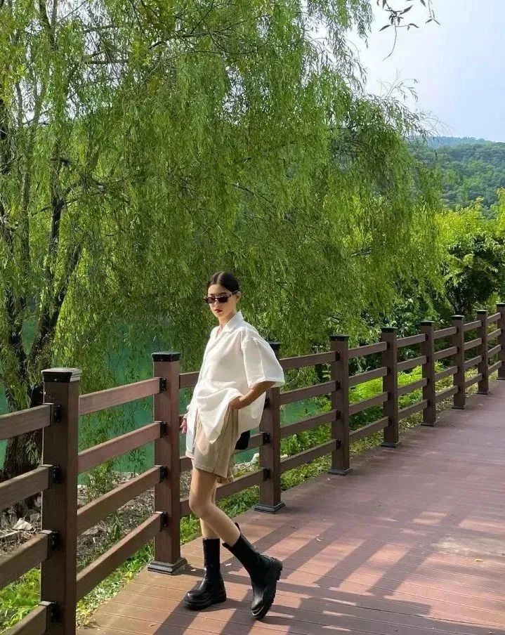 或者做复式穿搭,在短袖和短裤上外搭一件衬衣,休闲的同时透露出一种精英休闲感。搭配系带鞋拉长视觉比大面积露肤,在视觉上展现出腿的纤长感。