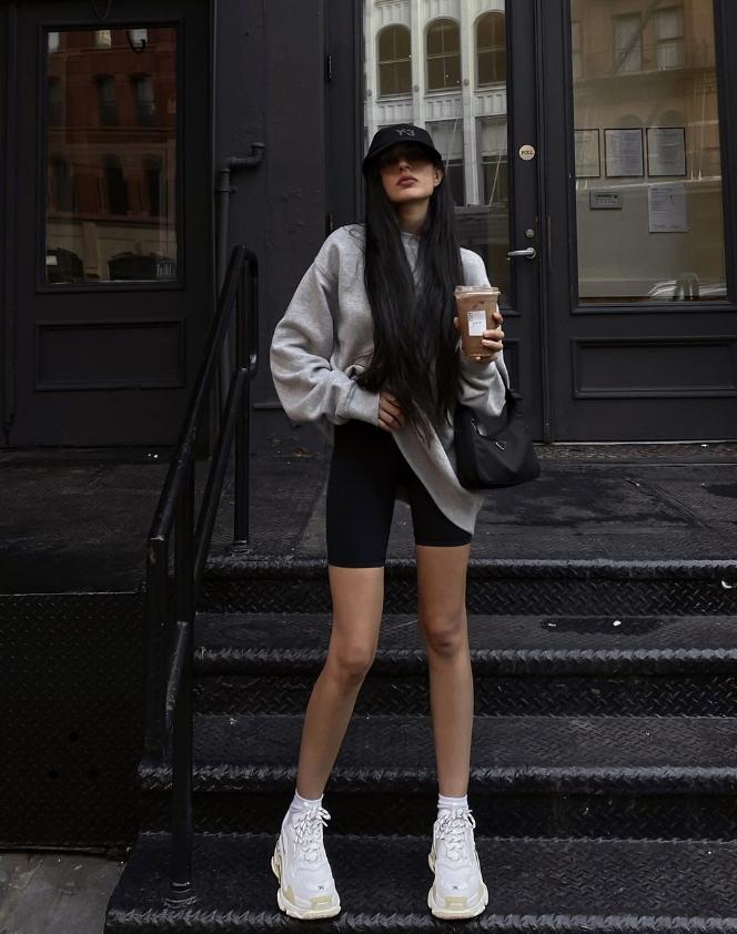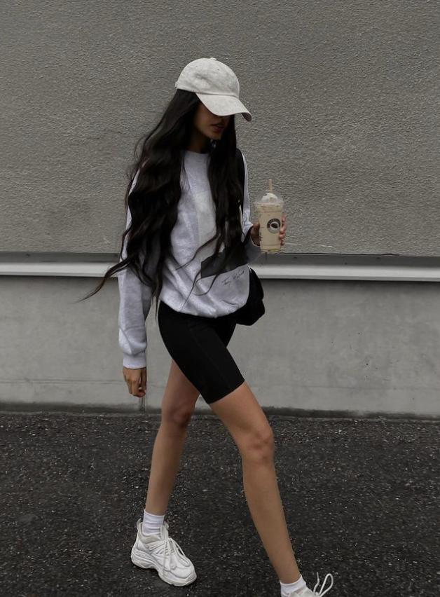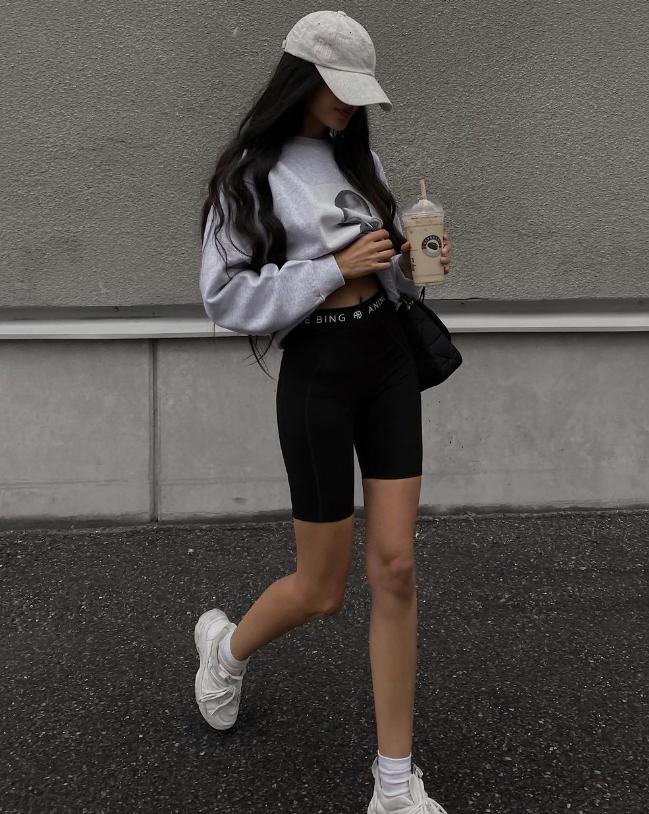 黑白灰的搭配最为经典,用收身卫衣搭配骑行裤,get到轻松且酷的休闲感。帅气与性感并存。