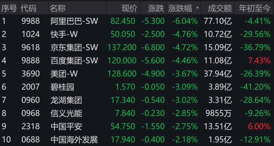 科技龙头普跌,阿里巴巴跌6.04%领跌蓝筹,快手、京东、百度跌超4%,紧随其后。医药、工业、有色、地产板块走弱,康宁杰瑞制药、三叶草生物跌超14%。
