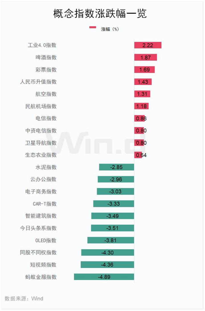 从盘面来看,Wind概念板块多数下跌,蚂蚁金服指数跌4.89%,短视频指数跌4.36%,同股不同权指数跌4.3%。涨幅方面,工业4.0指数涨2.22%,啤酒指数涨1.87%,彩票指数涨1.69%。