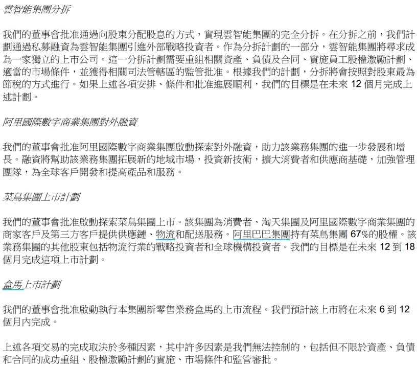 国联证券指出,阿里巴巴业务分拆高效推动,已有明确的时间表。2023年3月28日,公司宣布了新的治理和组织架构,即阿里巴巴将形成“1+6+N”的组织架构。本次财报中,公司进一步公布了六大业务的董事和首席执行官,并且明确了业务拆分的计划和节奏。除了淘宝天猫将由阿里巴巴集团全资持有以外,剩余的五大业务均可对外融资,单独上市。其中,智能云将在未来12个月内上市,菜鸟将在未来12-18个月内上市,盒马将在未来6-12个月内上市。本次拆分预计会让阿里各个业务轻装简行,提高组织的灵活性和战斗力,给公司带来新的生命力。