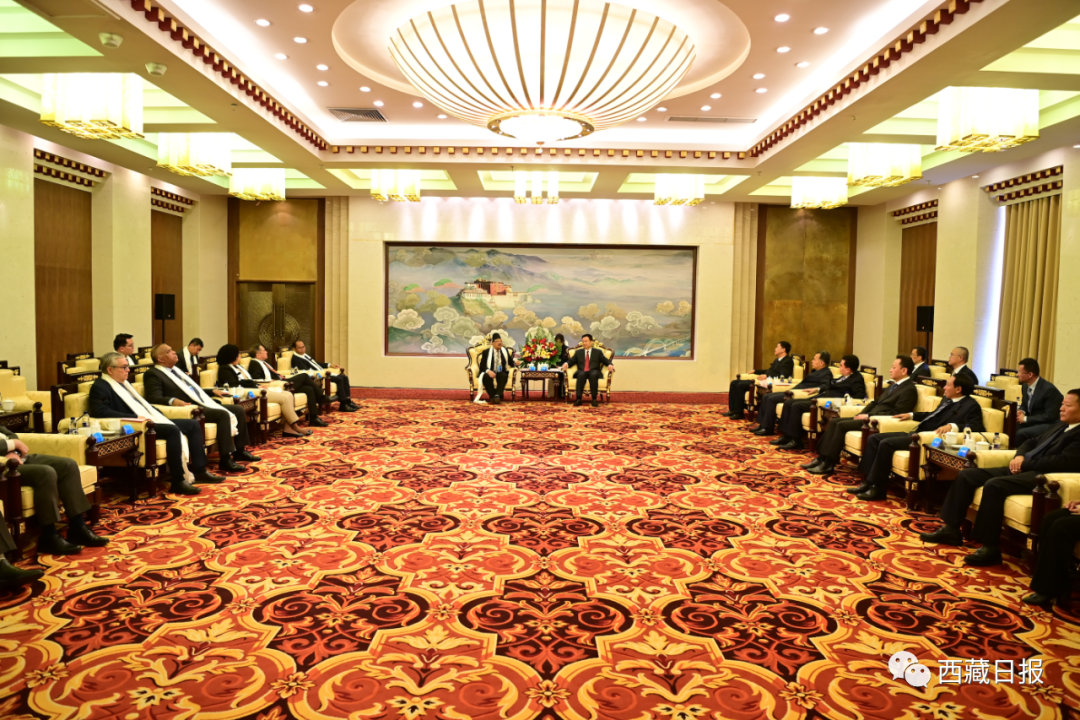 5月19日,自治区党委书记王君正、自治区主席严金海在拉萨会见了“2023·中国西藏发展论坛”参访团驻华使节一行。