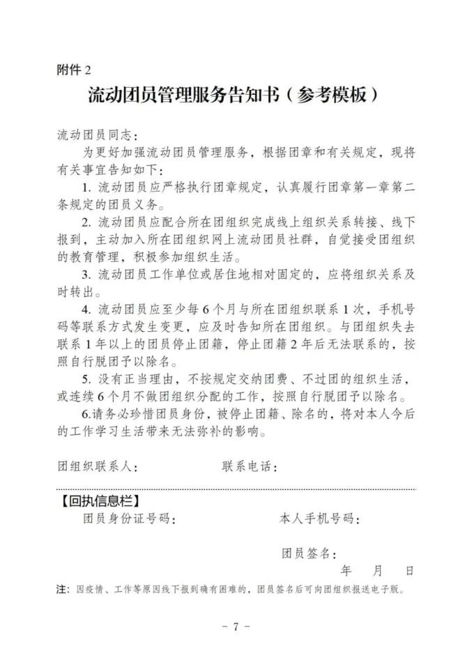 注意:①工作单位不具备建团条件的,可转至团员经常居住地或工作单位所在的乡镇、街道团组织。②乡镇、街道团组织确有接收困难的,可由县级团委建立“流动团员团支部”承担接收责任(下同)。